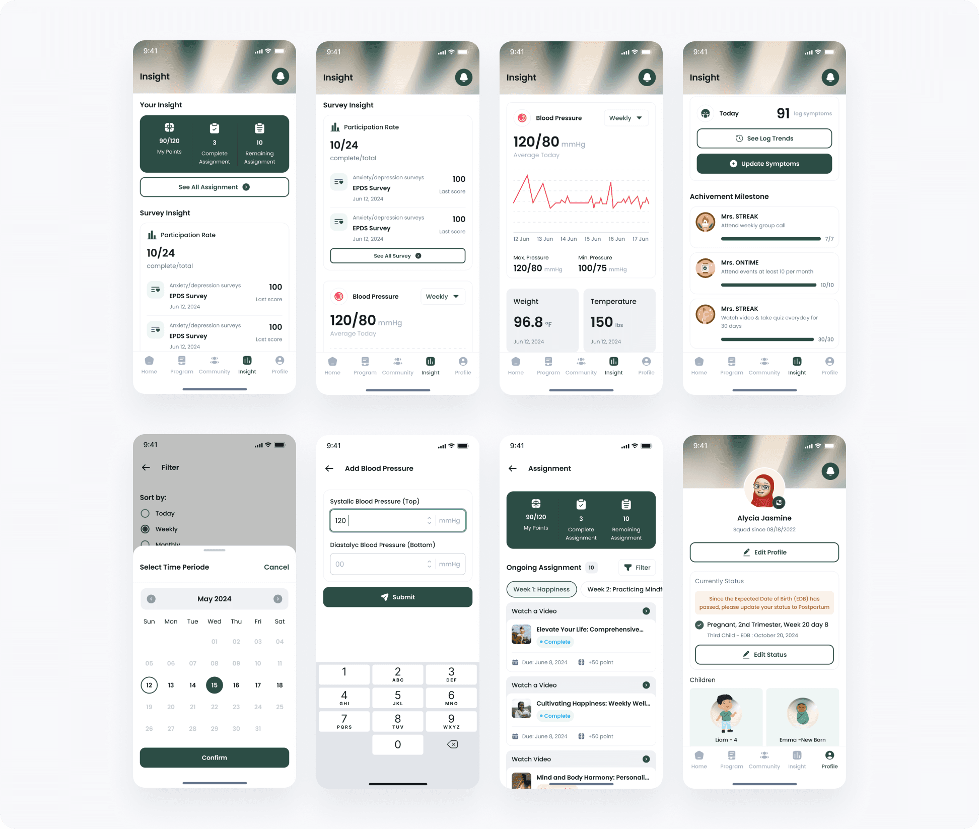 A key tool for tracking daily progress in pregnant women. AI evaluates data from weekly program completion and symptom logs, providing insights into the physical and mental health of mothers throughout pregnancy and postpartum.